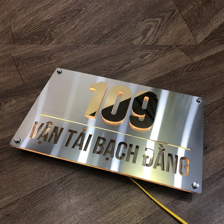 BẢNG, BIỂN SỐ NHÀ. Có đèn LED Inox Vàng + inox xước, số nổi 10mm chân mica trong mặt inox vàng, ngoài trời. BSN-QC24H017