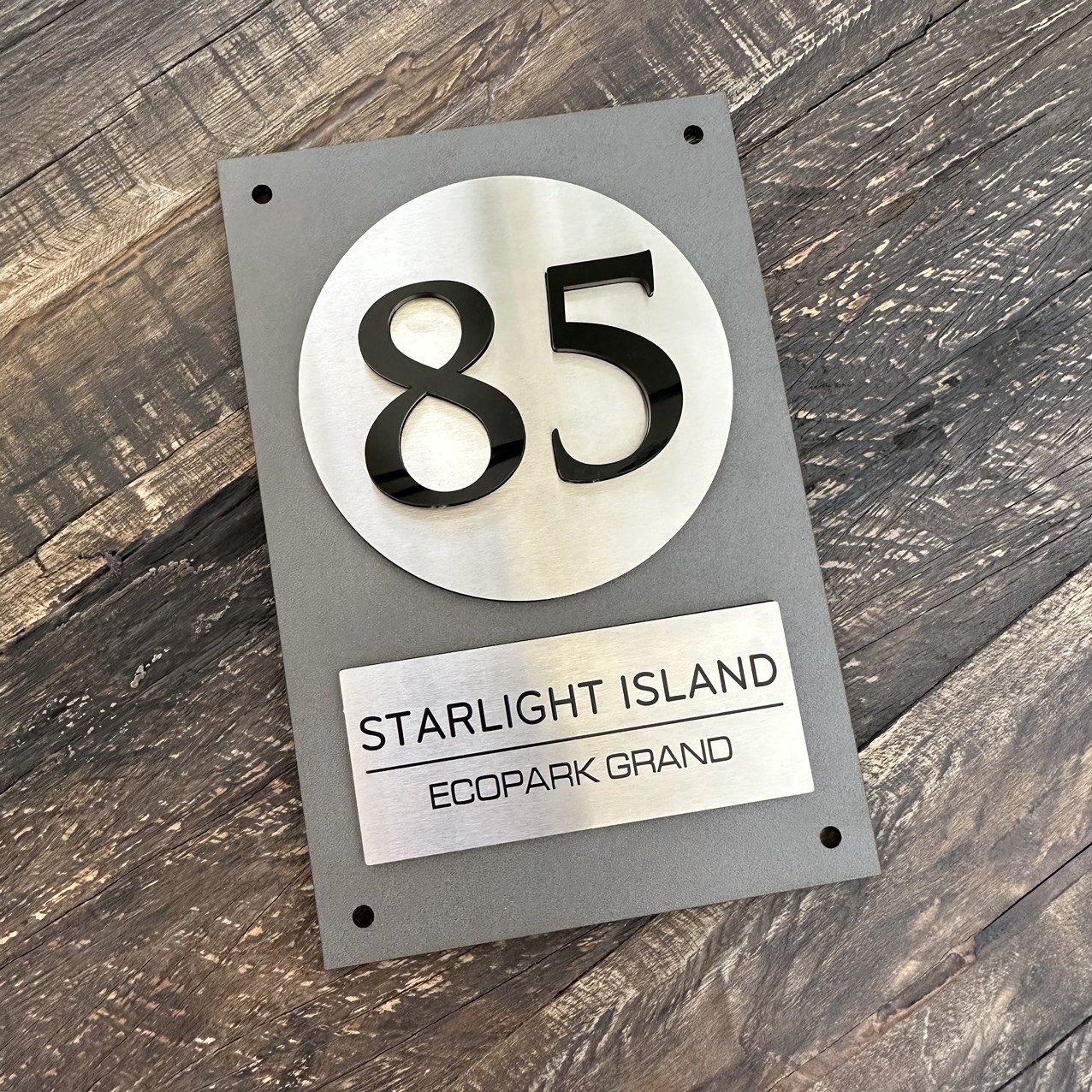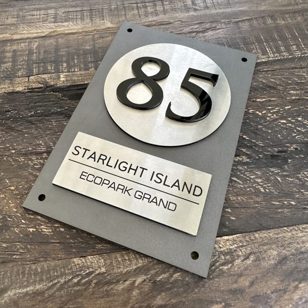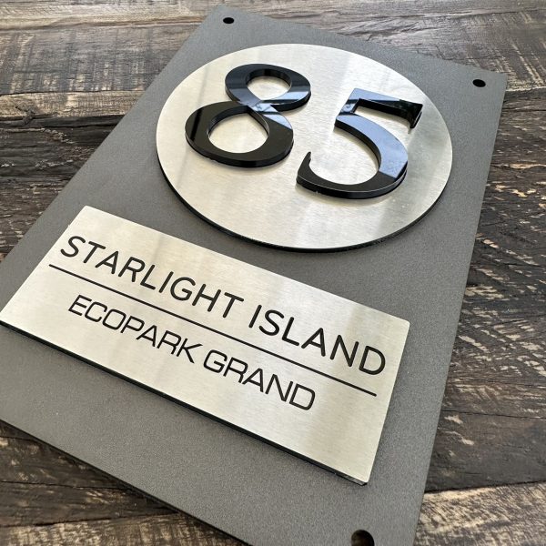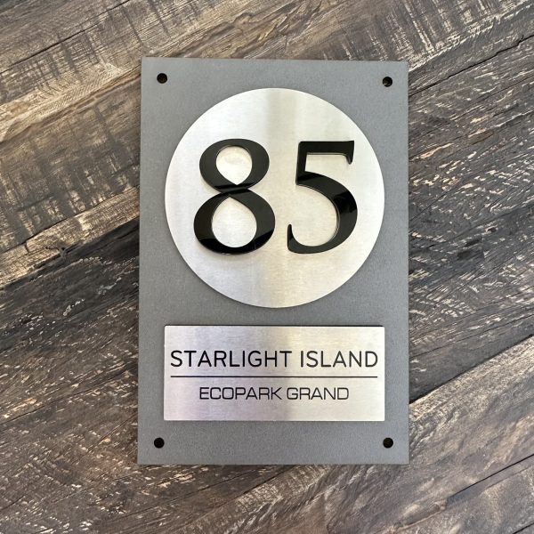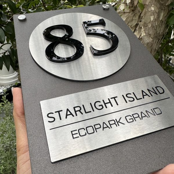 BẢNG, BIỂN SỐ NHÀ, Nền Alcorest + Mica cán ghi sần, Inox 304 xước bạc, số nhà nổi + in UV, ngoài trời. BSN-QC24H020