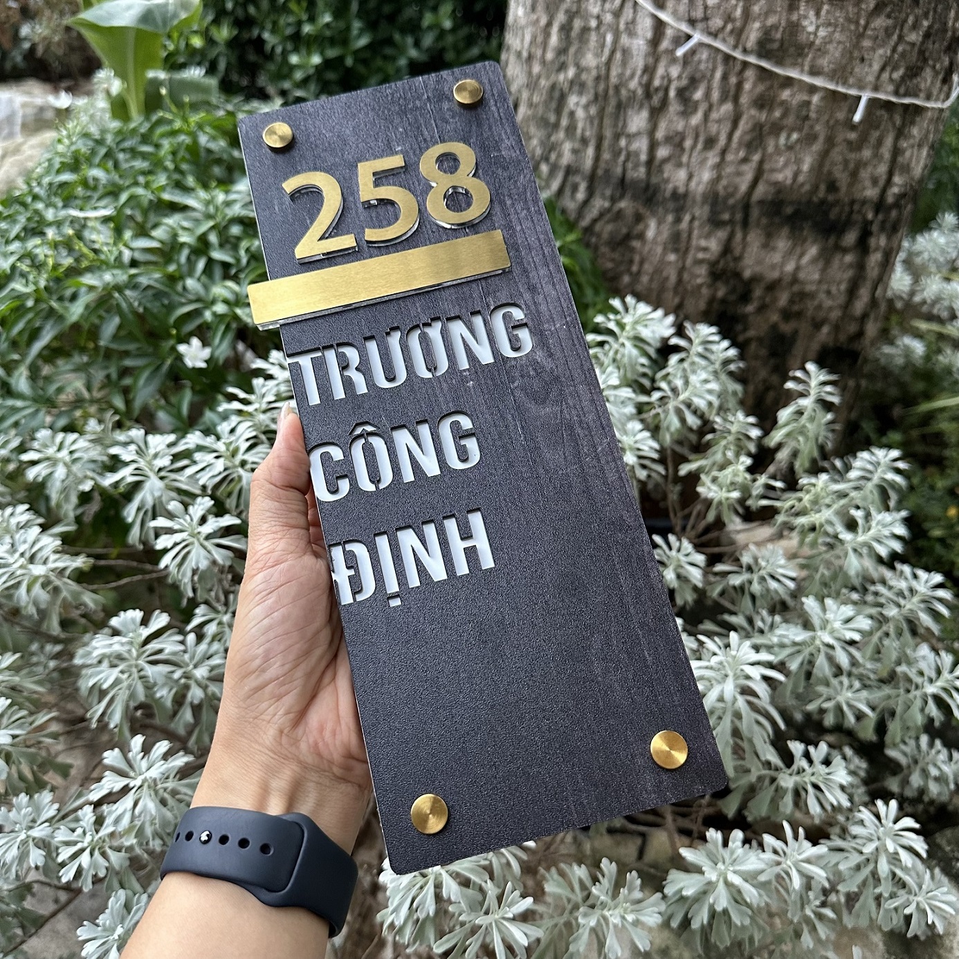 BẢNG, BIỂN SỐ NHÀ. Nền in UV vân gỗ, Nội dung nổi Inox xước vàng. Cao cấp, sang trọng. BSN-QC24H021