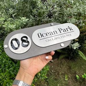 Mẫu biển số nhà 10x30cm với sự kết hợp giữa Mica cán ghi sần và Inox bạc xước mang đến một hơi thở hoàn toàn mới cho kiến trúc mặt tiền. Không bóng bẩy phô trương, sản phẩm thu hút bởi sự trầm mặc của tông màu ghi và nét sắc lạnh, sang trọng của kim loại xước.