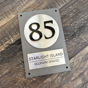 Biển số nhà hiện đại: Nền Alcorest & Mica ghi sần phối Inox xước bạc – Alo Bảng Hiệu